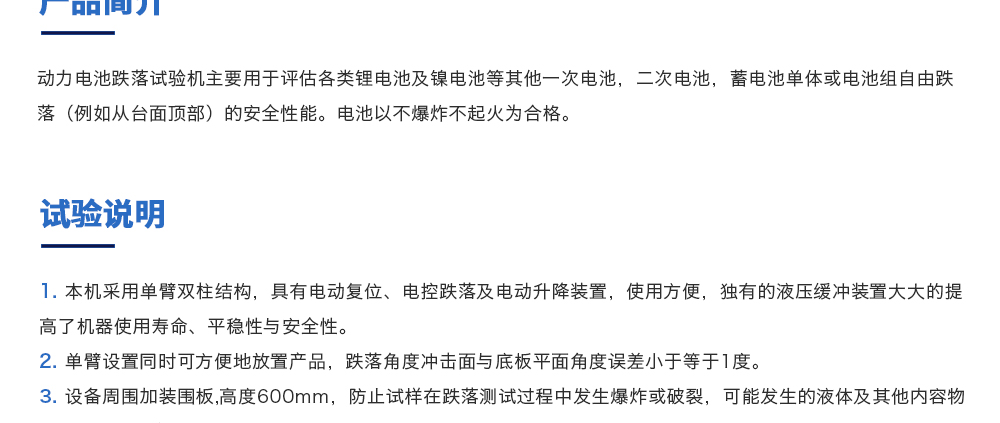 用途:動力電池跌落試驗機主要用于評估各類鋰電池及鎳電池等其他一次電池,二次電池,蓄電池單體或電池組自由跌落(例如從臺面頂部)的安全性能。電池以不爆炸不起火為合格。